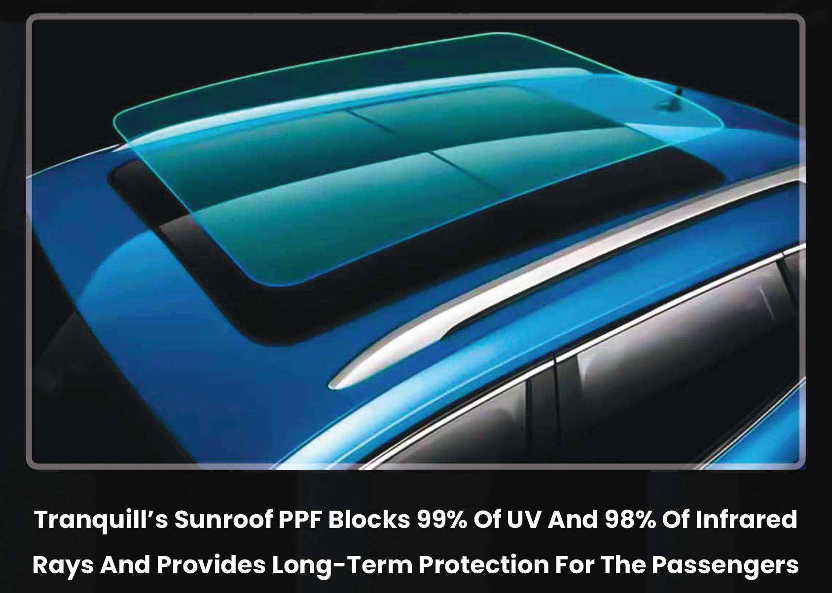 A sunroof adds style and openness to your vehicle – but it’s also directly exposed to sun, heat, and environmental hazards. Tranquill’s high-performance Sunroof Protection Film is designed to safeguard your glass from UV rays, heat buildup, and accidental impact, without compromising visibility or aesthetics Tranquill Sunroof Protection Film acts as a heat-reducing, shatter-resistant shield for your sunroof. It helps block intense solar heat, reducing cabin temperature and air conditioning load.